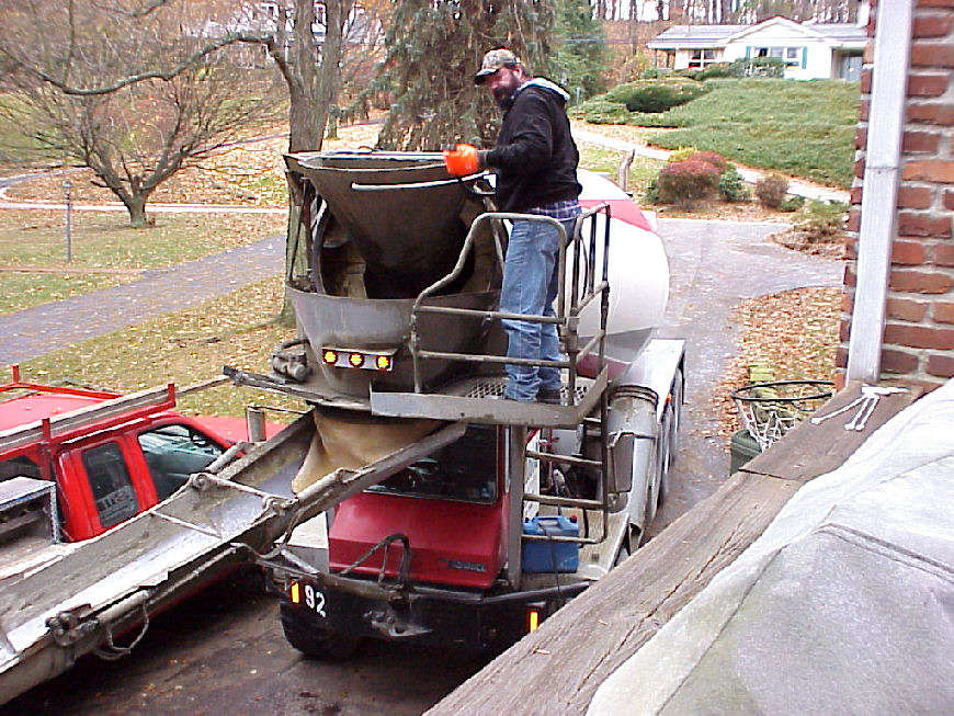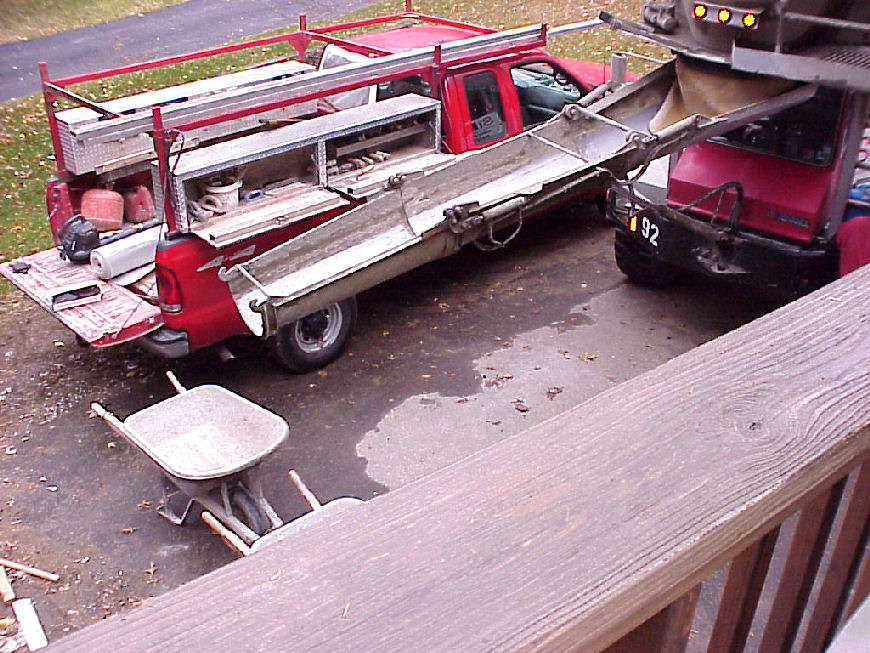 | Cement truck is in the driveway and ready to begin pouring. | Planks are set down for wheelbarrows to bring in the cement. | |