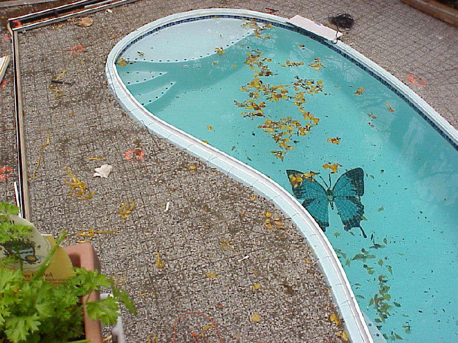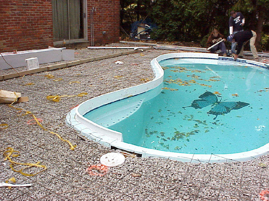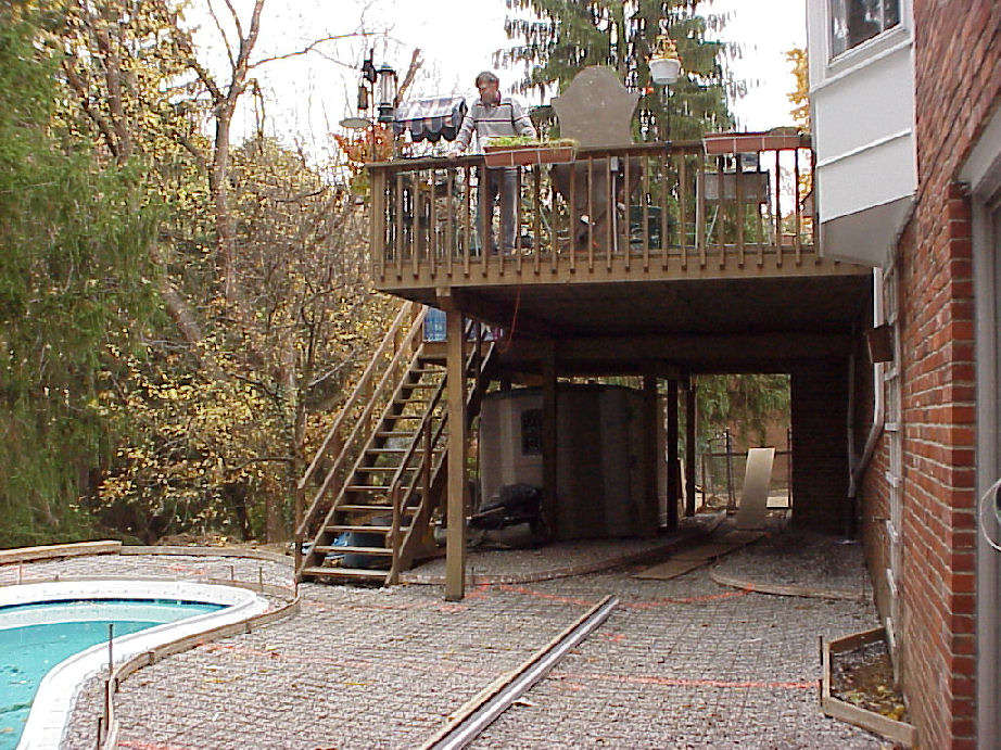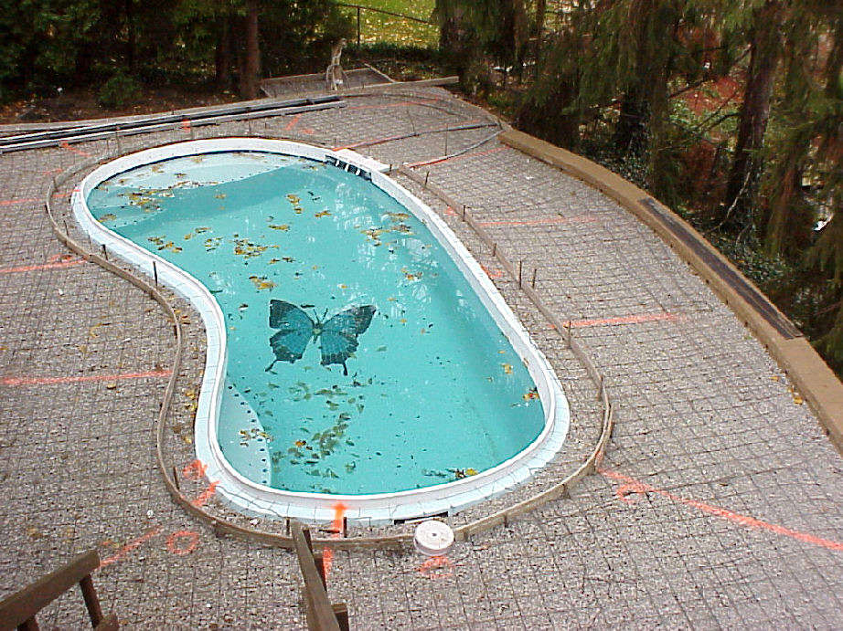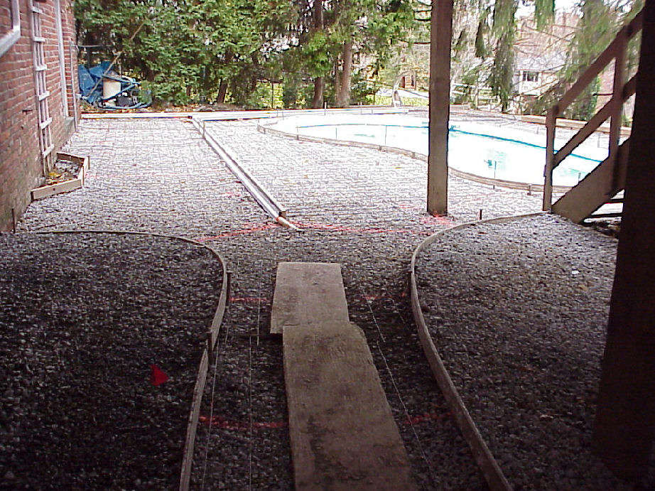 | Above photos show the border forms that will be used for the terracotta color border that we will have around the pool's edge. | This view is taken from the driveway side looking out under the deck toward pool. | |