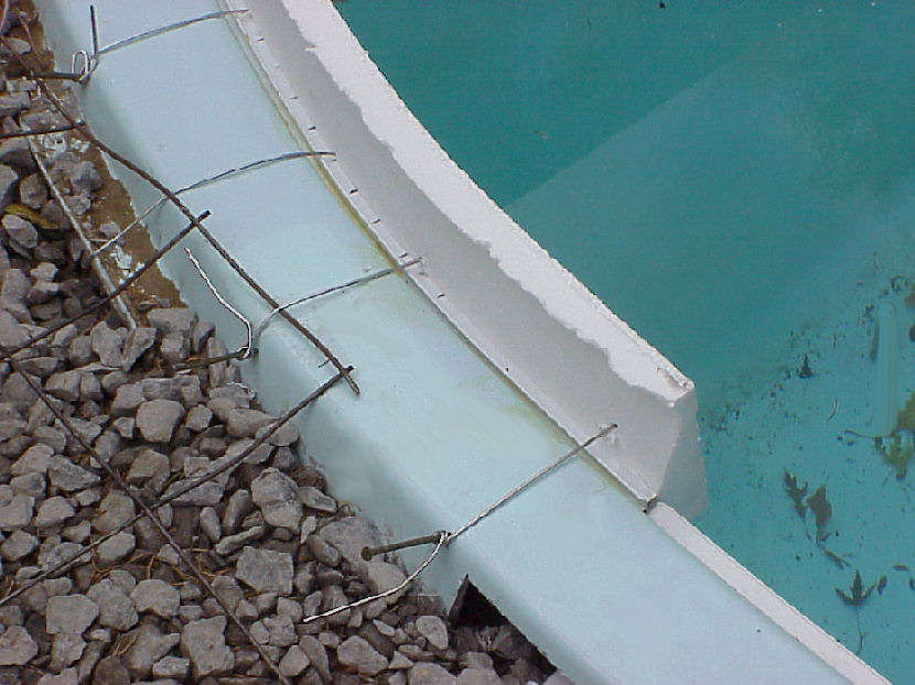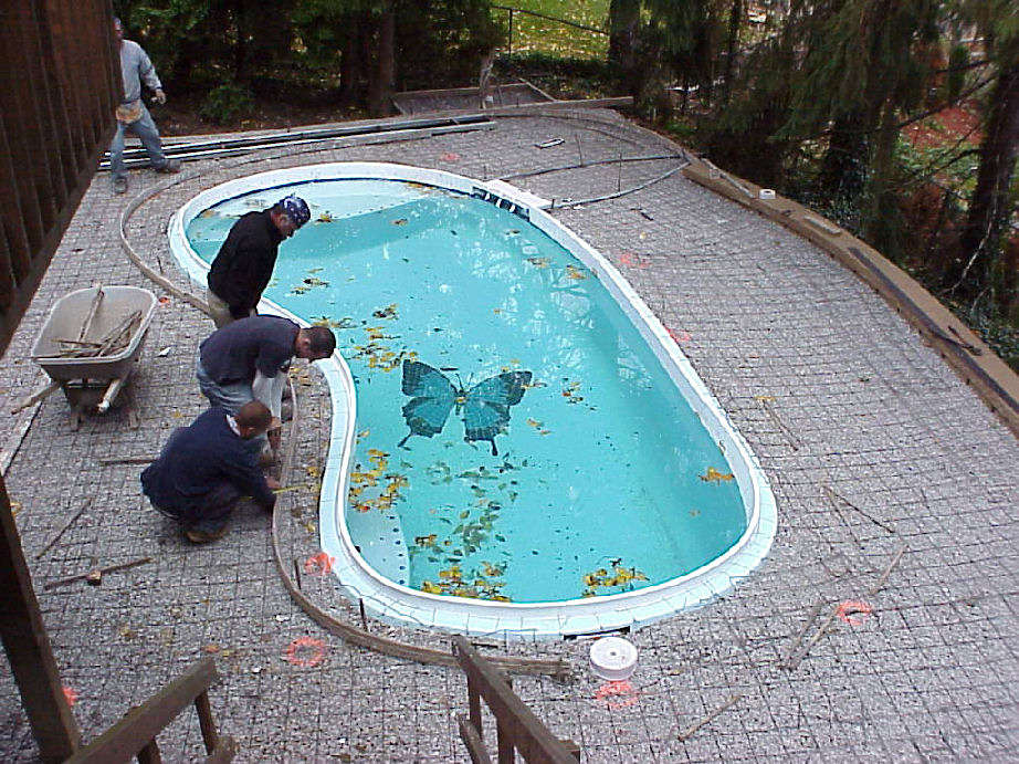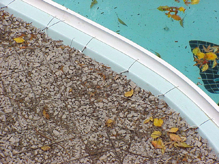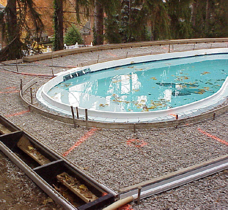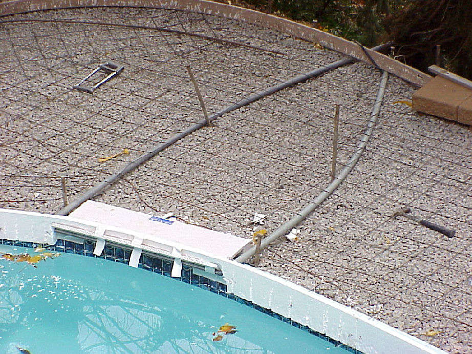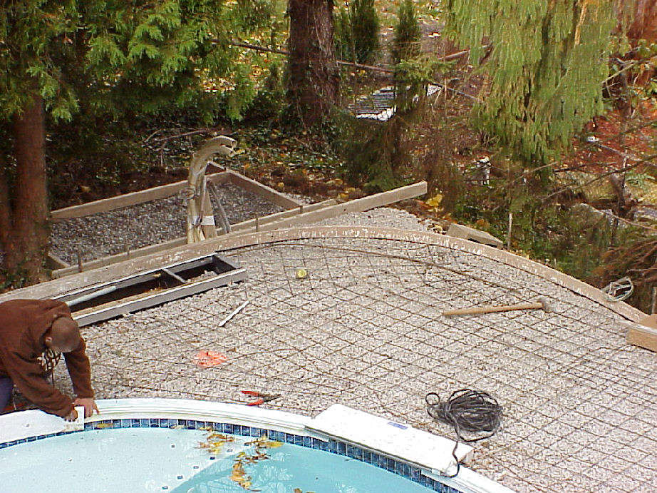 | Photos above and below show the wire mesh grid that was laid over the gravel base. Below right photo shows the conduit for the waterfall fiberoptic lights and electrical wiring. Styrofoam molds are being attached to the pool's edge that will shape the cement border that will cap the pool. | ||