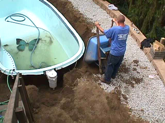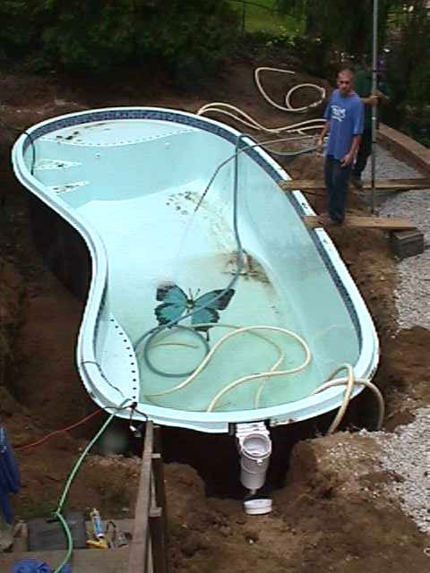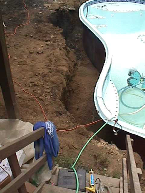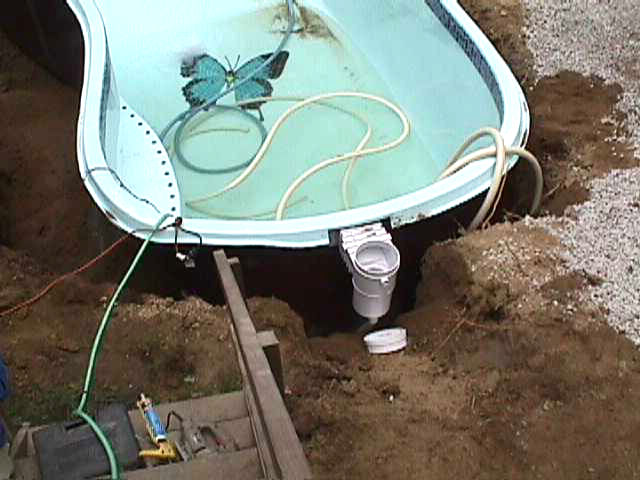 Skimmer is installed and plumbing lines are set in place. Water is placed inside the pool and water with sand is poured around the outside as the pool installers constantly check the transit to make sure pool is level. This is a very tedious process and took several days of adjustments as time was needed for the sand and water to settle. |