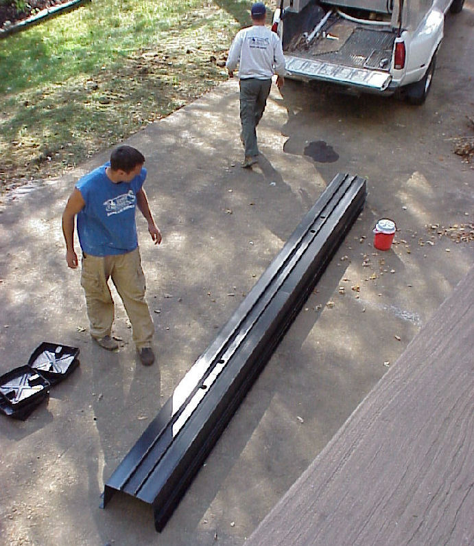 ![]() Pool installers begin to assemble the auto-cover box. |